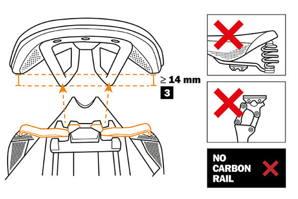 Für die Montage des Adapters muss es möglich sein, die Kunststoffwangen mit Schrauben zwischen den beiden Sattelstreben zu fixieren (siehe Bild). Der Abstand sollte hier zwischen 45 und 60 mm betragen.